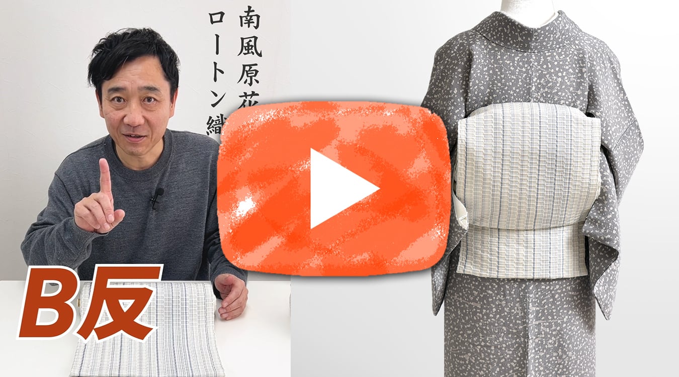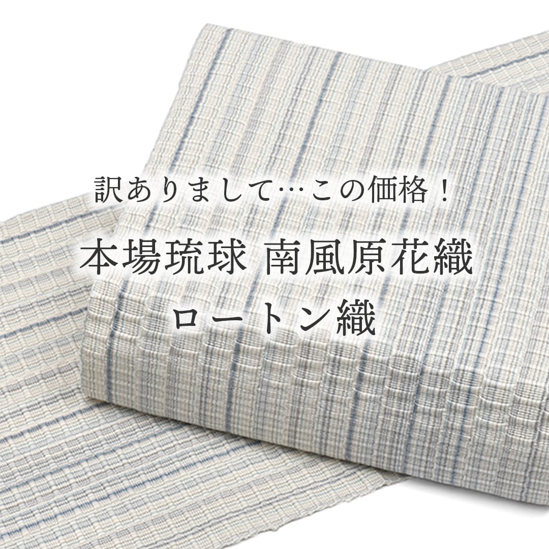 【商品について】 ・名古屋帯・全通柄模様・素材:絹 ・サイズ:幅 約 29.5cm 長さ 約370cm 【合わせるお着物】小紋・御召・紬 【場面】 カジュアル 【季節】 春・秋・冬 【商品番号】 22134 全くの織り上がりホヤホヤなのに ちょっとB反!という理由で ぜったいお得宣言! 本場琉球 南風原 経済産業大臣指定 手織り ロートン織 八寸 名古屋帯 ご紹介! こちらの帯は、先日 沖縄の南風原の機屋さんに お伺いした時、、 「この帯・・幅が約1.5センチだけ 狭く織り上がっちゃって、、 あとは全く問題ない、織り上がりホヤホヤなのに ・・帯が可哀そうやし、仕入れてもらえない?」 と、、言われたら! 帯を愛するおびやとしては 断る理由がありませんよね!! 通常、琉球の帯は 厳しい審査に通らないと 証紙は貼れないのですが 写真にあります通り こちらは一度審査を通り あとから・・あっ!幅は少し狭いわね! と気づいた・・ それほど! 検査員が一見しても 分からなかった帯! 私が見ても、狭い帯!・・とは 全く感じませんでした! だって!コーデ画像を見て下さい! ねっ♪違和感まったくありませんでしょ~♪ そのような理由からB反扱いで めちゃくちゃお安く仕入れてこられた 間違えなく!掘り出し帯♪ 通常幅が31センチに対して こちらは約29.5センチ 約1.5センチだけ狭い、それだけ!! あとは全くの織り上がりホヤホヤ新品♪ もちろん!その他は 新品と同じ手間暇と、手織りの 質の高さはあります! またスッキリとした配色ですので 少し幅が狭い分、よりスッキリと締めらます! すいません、、いいように言いまして・・ 長さは通常通りの長さとなります! 〇糸の整経 〇手括り 〇糸染め 〇織 と、全ての工程を 沖縄県 島縞郡 南風原町の工房で行われ 一貫管理だからこそ感じる 色と織のバランスがとてもいい♪ 南風花織 の機屋さんで 今もっとも注目を集めている 活気ある産地の帯に 間違いありません!! そのような活気ある機屋さんから 生まれる帯というのは より魅力がある中 こちらの帯・・・ 見て頂けました~♪ 琉球王国時代 貴族専用で 身分の高い人しか着ることができなかった 花倉織、ロートン織 昔から・・・手間と時間が とてもかかる事で、高価な織物と されていたロートン織であり、、 琉球には色々な織物がありますが 中でもロートン織は シンプルだからこそコーデに合わせやすく さりげなく琉球をアピールできる♪ それでいて!質の高い織であることは 周知の事実であるため 堂々と胸を張り! どう♪ロートン織よ~♪”と 締められる帯! 通常の凹凸よりも 柄部分の色数を多くする事で 光の受け方で、より ロートン織が浮いて見え そうです! 琉球のロートン織は 浮かせて見えてなんぼ! コチラの帯を合わせるお着物は 紬系のお着物が一番合い! 普段着の紬のお着物はもちろんですが お持ちの紬の中でも、ちょっと良い お高い♪上質な紬のお着物に、はやはり! 上質な紬帯が合い♪バランスよし♪ 柄は全通織となりますので 前腹の柄出しを気にすることなく どう締めても 柄がしっかりでるのが 嬉しいですよね♪ 訳あり!約1.5センチ幅が狭い という理由でB反物扱いとなった! でも!あとは全くの新品♪ 掘り出し帯宣言させて頂きます!