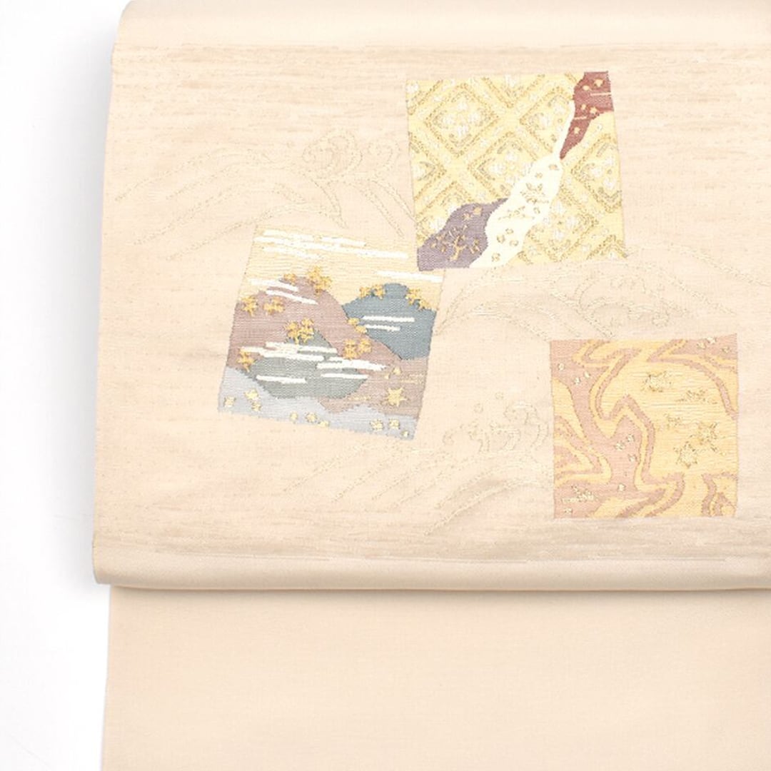 [名古屋帯]手織 すくい織り 京都名門 織彩 謹製 波枠文様 九寸帯 正絹 日本製(商品番号:21998)