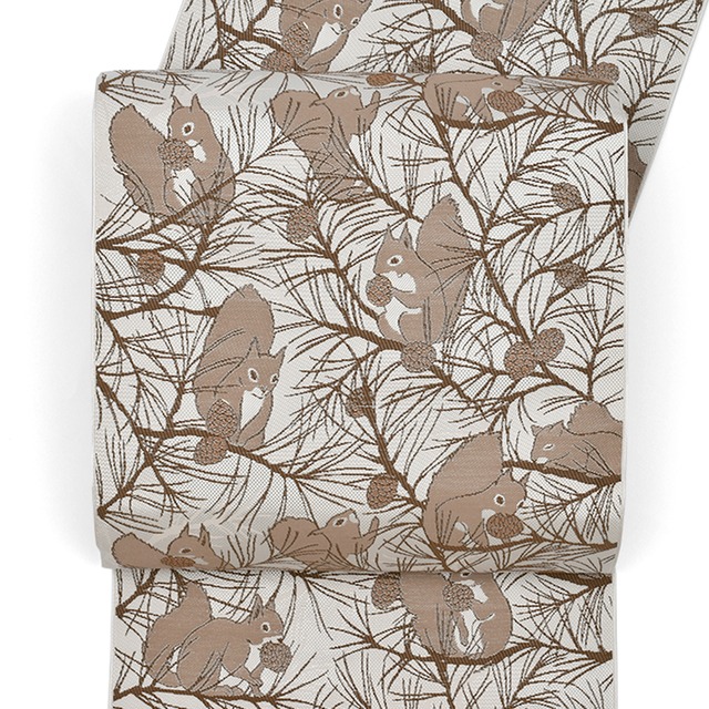 [名古屋帯]博多織 協和織工場 謹製『絲衣』栗鼠と松 八寸帯 正絹 日本製(商品番号:21703)