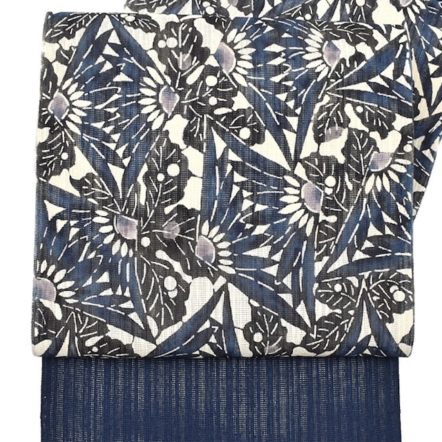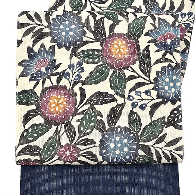 【商品について】 ・名古屋帯・六通柄模様・素材:経緯糸 諸紙布 ・サイズ:幅 約31cm 長さ 約370cm 【合わせるお着物】 (袷/単衣/夏)・小紋・御召・紬・麻 【場面】 カジュアル 【季節】 オールシーズン 【商品番号】 21787 間違えなく! このクオリティーでお値打ち帯! 諸紙布 紅型染め 小千谷 西脇商店 謹製 八寸 名古屋帯 オールシーズン帯 ご紹介! コチラの帯を作られたのは 新潟県 小千谷にある西脇商店さんであり 江戸時代 安永二年 1773に創業と 小千谷地区で老舗であり、その西脇商店さんが 諸紙布の上に型染めを施した 逸品なのですが おびや店長鈴木が一目惚れで 仕入れてきた帯となり♪ 正直言うと、第一印象は・・・ 「えっ?諸紙布で紅型調の型染めで・・ このお値段でいいの?間違えてない?」 と、本当に感じた・・はい!! お値段以上の価値を、締めるとさらに! 感じて頂ける逸品帯! 一目惚れした店長鈴木が、自信を200%持って おススメさせて頂きます! 型染めの中でも、輪郭がハッキリではなく、 染めの工夫によって、少しぼやけたような 柔らかな風合いを染料で表現することで、、 例えば・・琉球のびんがた染めですと ハッキリとした輪郭が、キツイ印象を 持たれる方でも、 柔らかさの中に感じる、鮮やかさは 幅広い方に楽しめる紅型染めとなり 余談ですが・・ 柔らかな印象の紅型染めに、合わせやすさを 感じられる方も多く、人気が高いのですね! 帯地の糸は紙糸が使用されており、 紙布とは、和紙を細く切り撚りをかけて 緯糸として織った布のことをいい、 経糸と緯糸とも両方に、紙布を使用し 織り上げた帯を特に諸紙布と言います。 紙の糸・・と聞きますと、 頼りない?溶ける?と、思われる方も おられるのですが、 いえいえいえいえいえ! 溶けることはなく!絹よりも丈夫な糸として 扱われており、、 近年は、紙布の糸を作る職人さんが激減しており、 そのため経緯糸ともに紙布を贅沢に使用する帯は とても貴重な帯とされております! 触った質感は、麻ののようなザラついた 天然素材の風合いを感じ取れます。 また、諸紙布の帯地は一年を通して 締められる帯地とされているのですが アップの画像でもお分かりのように 透けた織の風合いとなりますので、 気になる方は 単衣/夏の帯として お締め頂ければと思います。 柄は抽象的なお花の柄となり 季節を限定する柄ではありませんので 単衣、夏はもちろん、、これぐらいの透け感なら! と、ご自身で感じられましたら 真冬は・・さすがにお勧めしませんが 気温が温かくなっても、まだ袷の季節であっても 問題なくお締め頂け! そう考えると・・ 一年を通し長くお締め頂ける帯なのですよね♪ ステキな柄、お気に入りの柄になれば 長く締めたいですよね♪