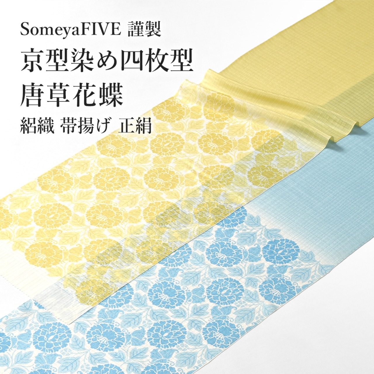 [帯揚げ](単衣/夏)京都 SomeyaFIVE 謹製 京型染め四枚型 唐草花蝶 丹後岩滝産 絽織 正絹 日本製 (商品番号:21636)