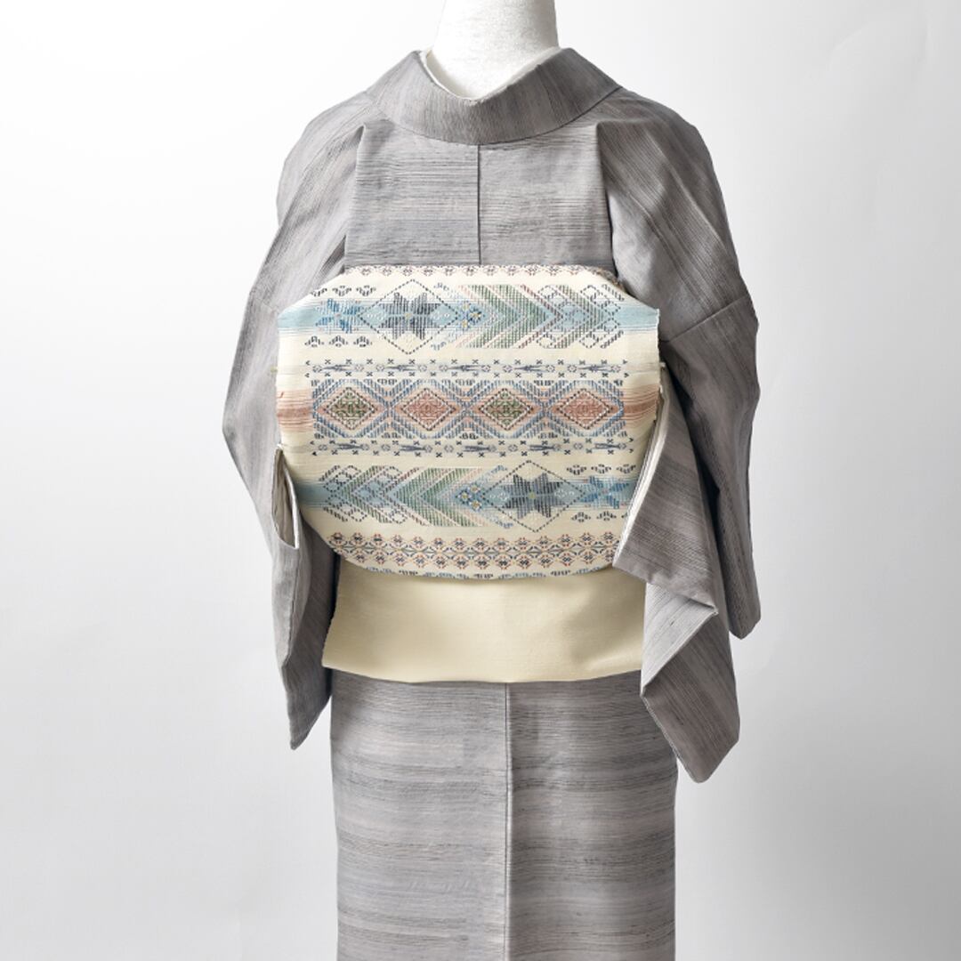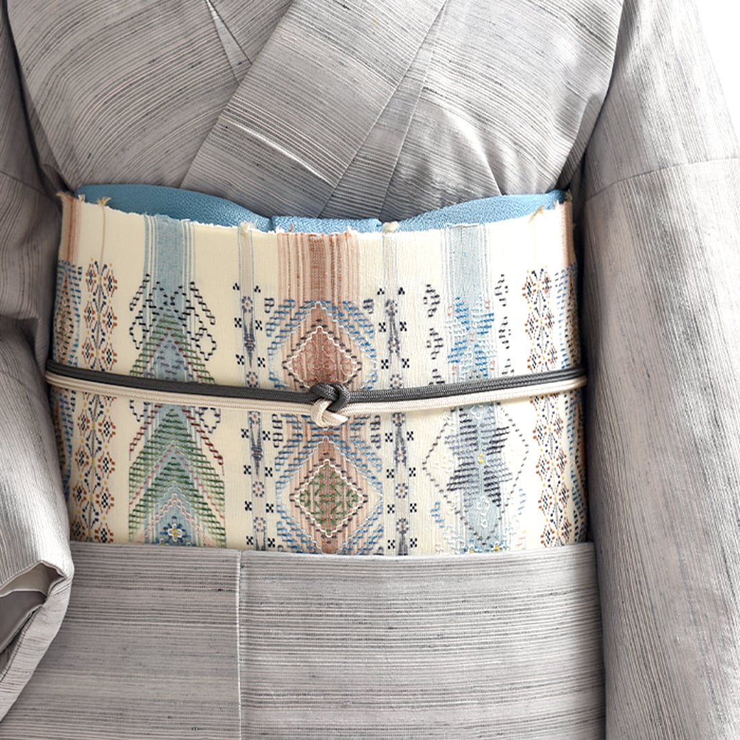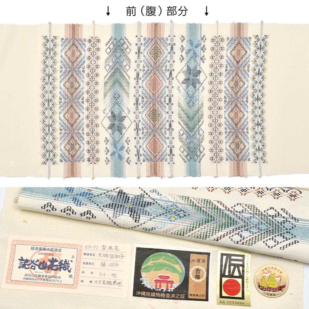 [名古屋帯]本場琉球 読谷山花織 大城佐知子 作 香風花 手織り 本草木染 灰ザクラ 九寸帯 正絹 日本製(商品番号:21696)