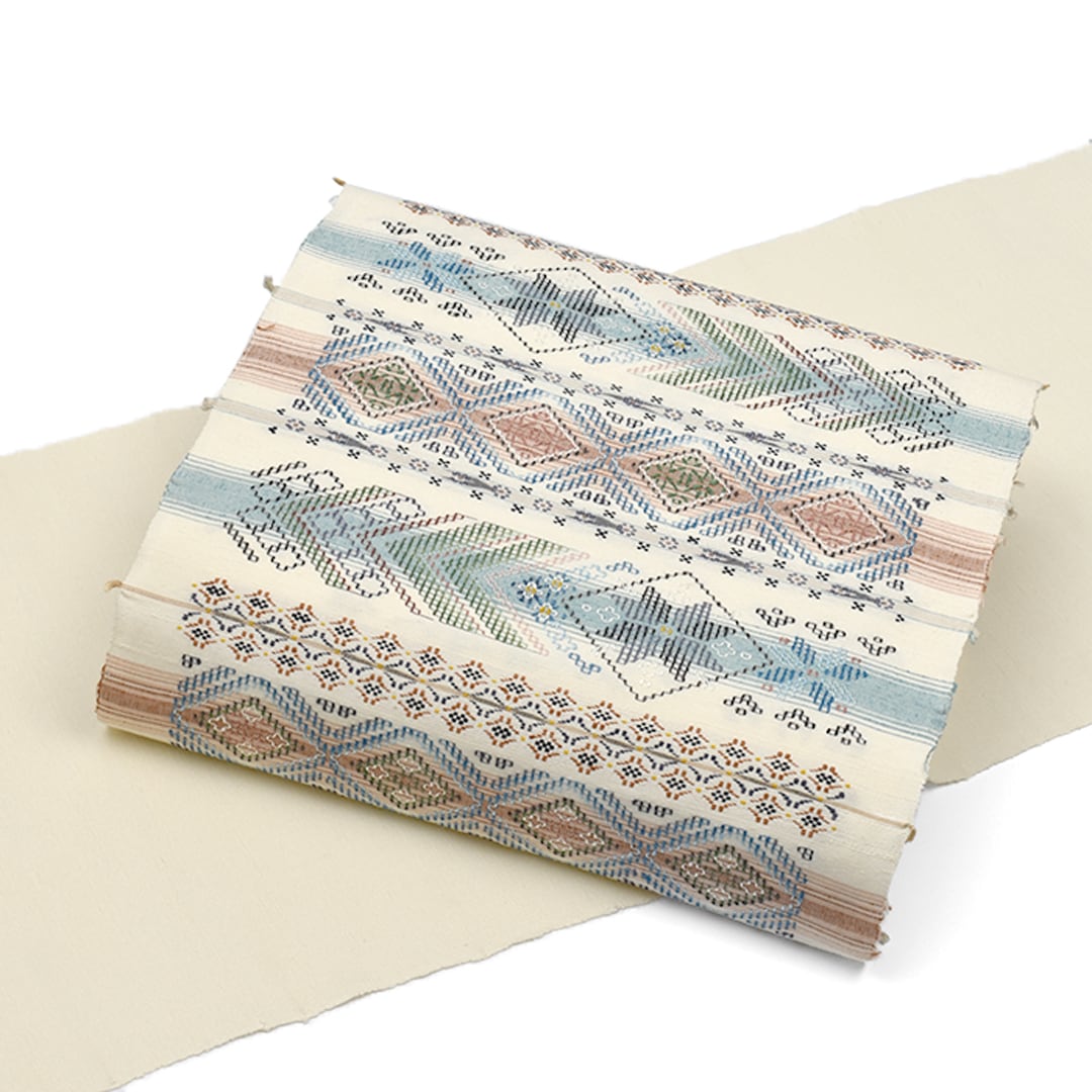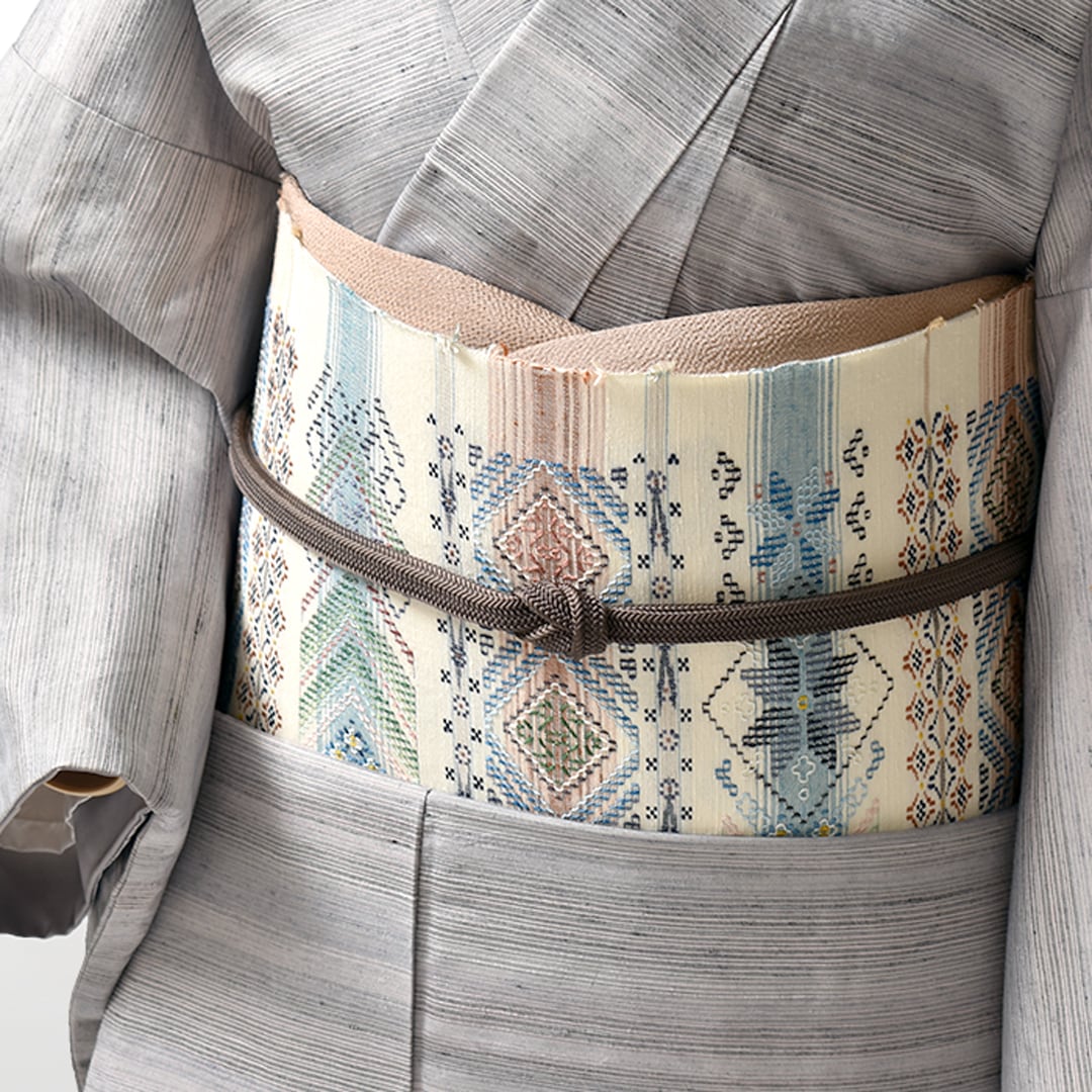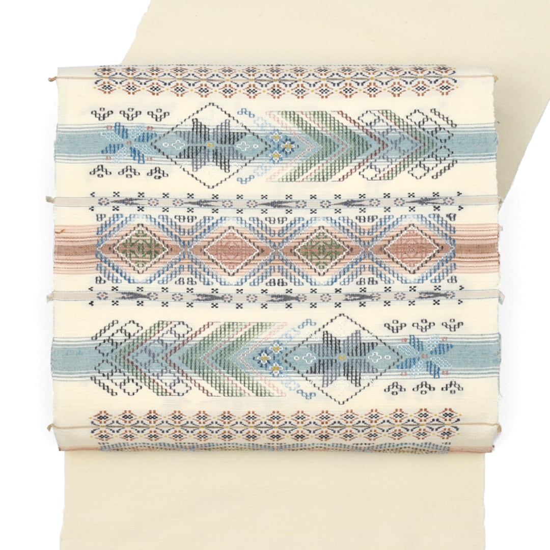 [名古屋帯]本場琉球 読谷山花織 大城佐知子 作 香風花 手織り 本草木染 灰ザクラ 九寸帯 正絹 日本製(商品番号:21696)