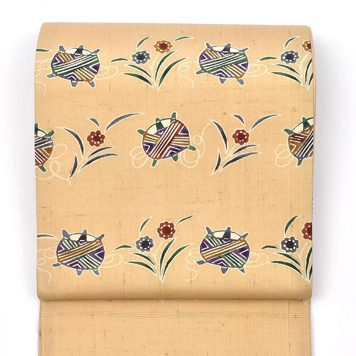 [袋帯]【メンテ済み/中古帯】(お仕立て上がり)生紬 型染め 糸巻き柄 正絹 日本製(商品番号:21734)