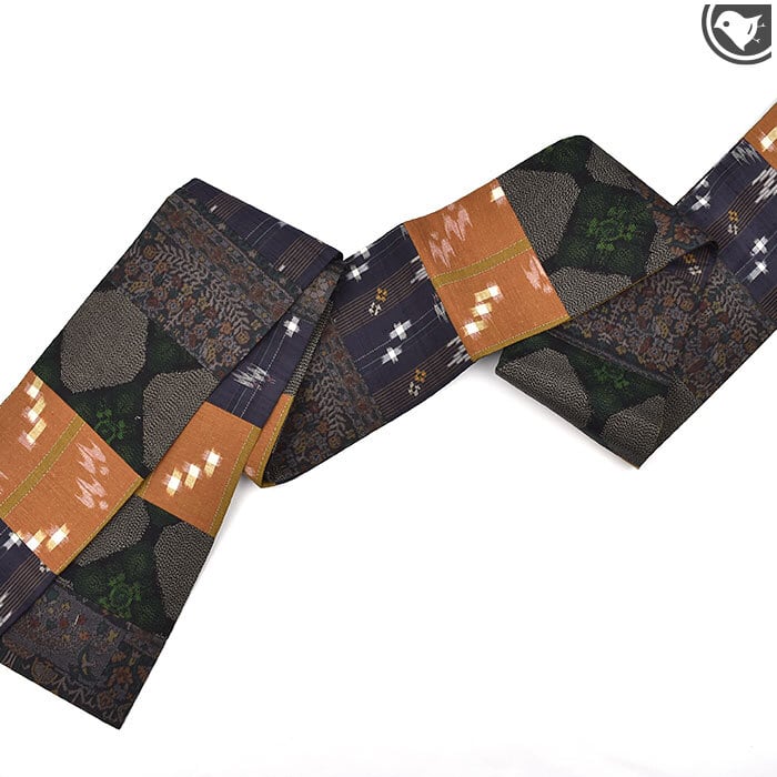 [半幅帯](仕立て上がり)琉球絣/十日町紬 切りばめ 全通柄文様 正絹 日本製(商品番号:21813) お仕立て代込み!送料無料!