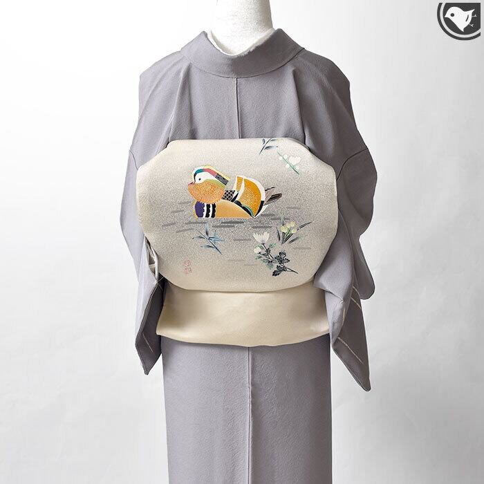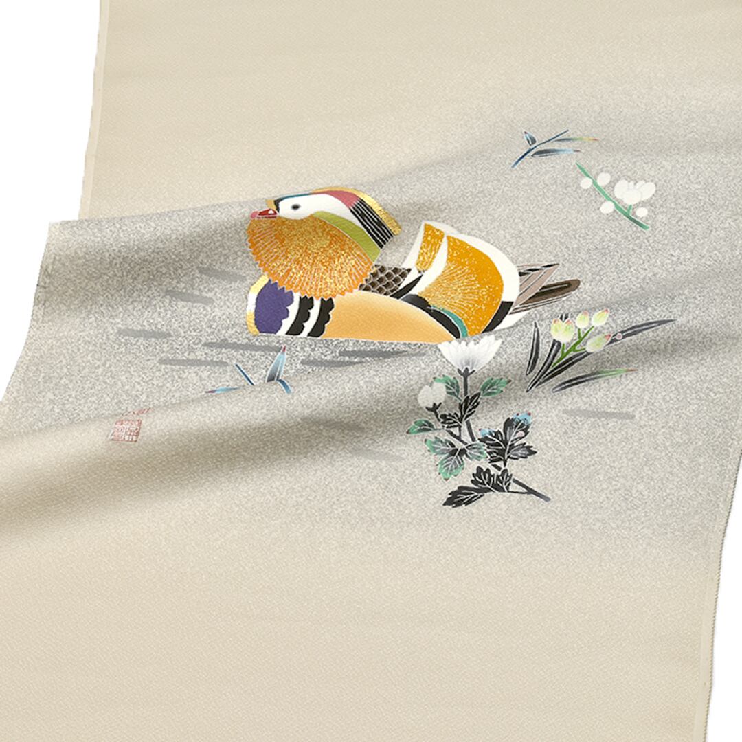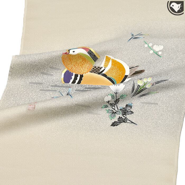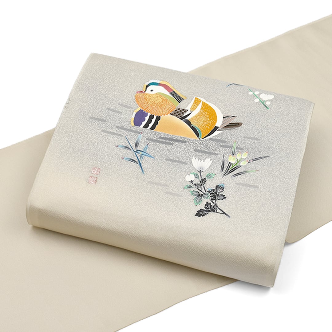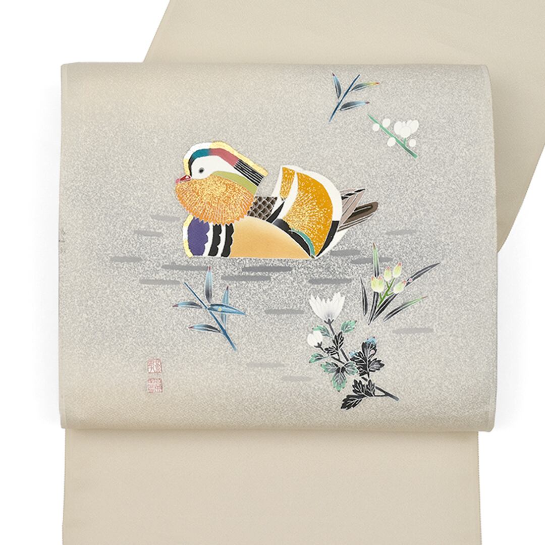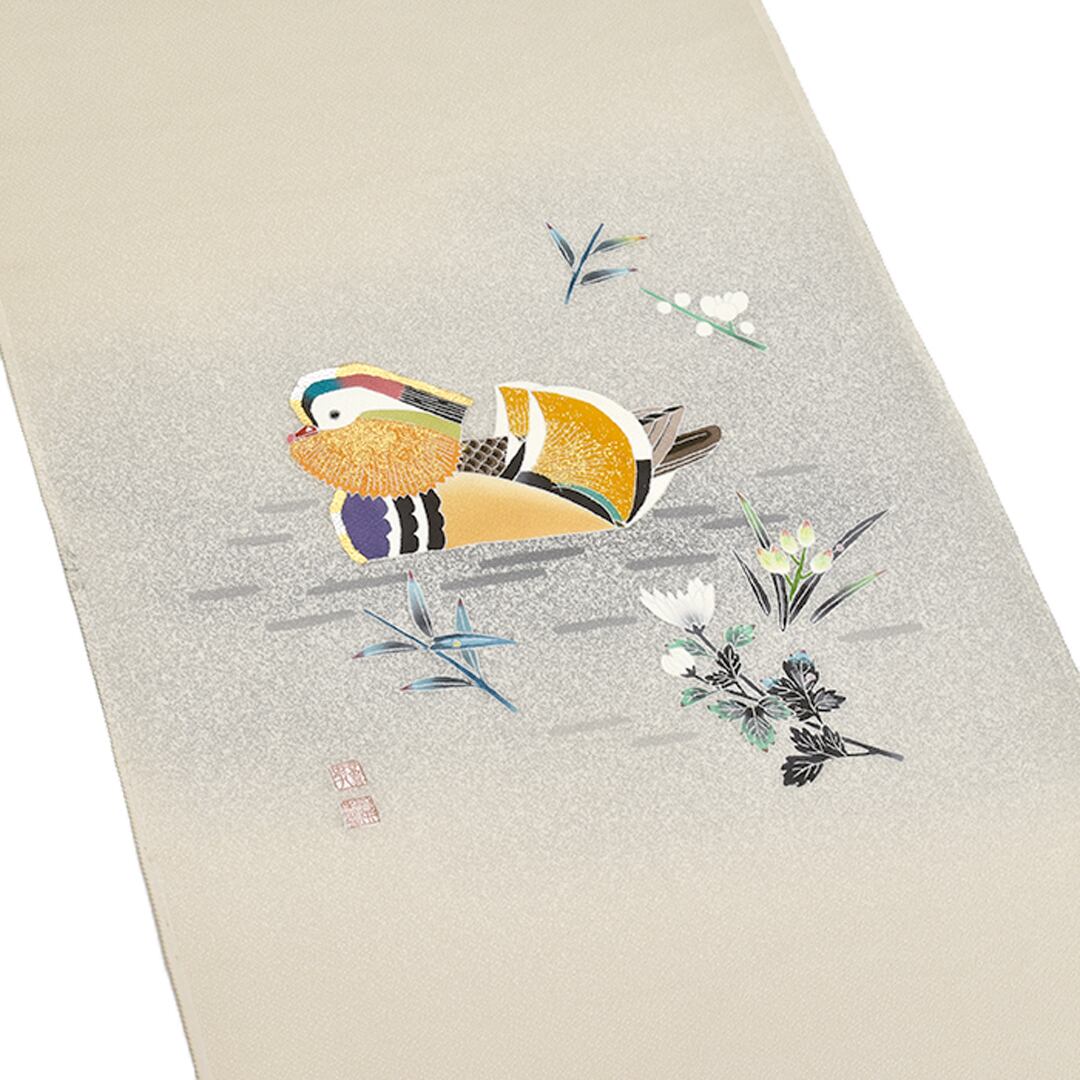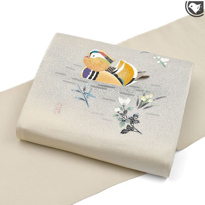 [名古屋帯]羽田登喜男×羽田登 羽田工房 謹製 鴛鴦柄 縮緬地 九寸帯 正絹 日本製(商品番号:21966)
