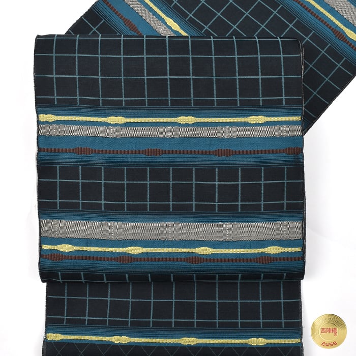 [名古屋帯](オールシーズン帯)西陣織 名門 有栖川織物 謹製 吉野間道 格子 九寸帯 正絹 日本製(商品番号:21937)