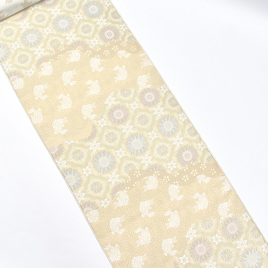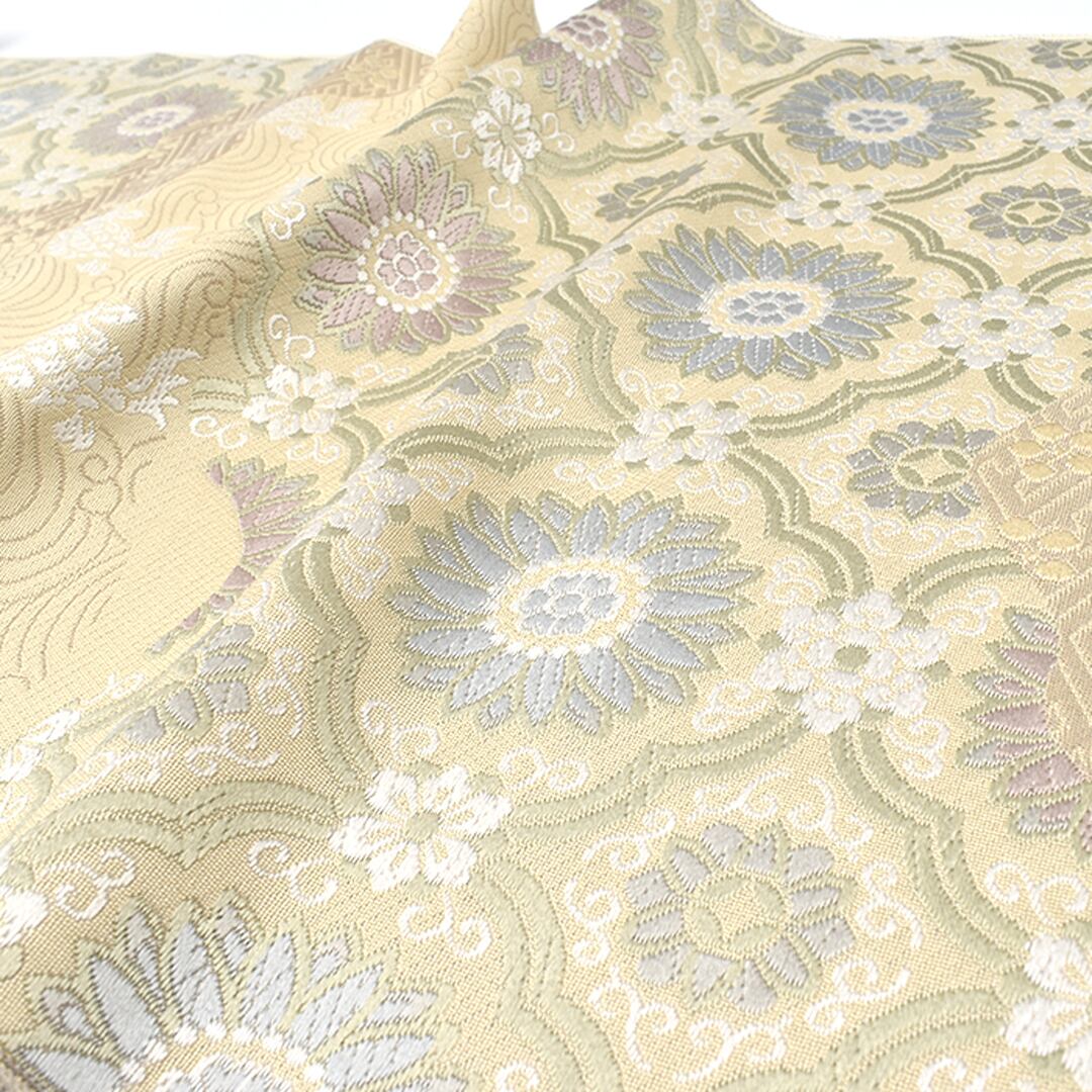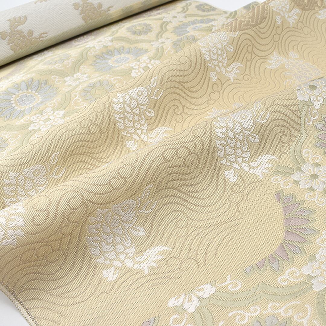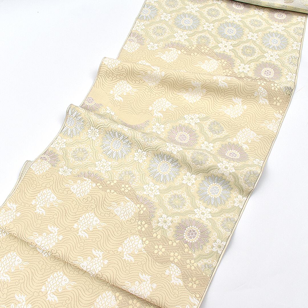 [名古屋帯]西陣織 老舗 志都香 謹製 名物裂文様 唐花/荒磯 彩麗絹 九寸帯 正絹 日本製(商品番号:22061)