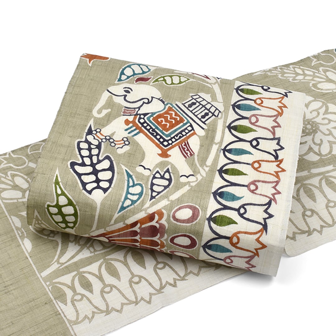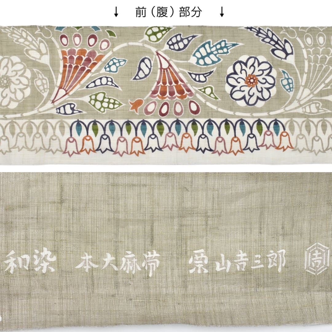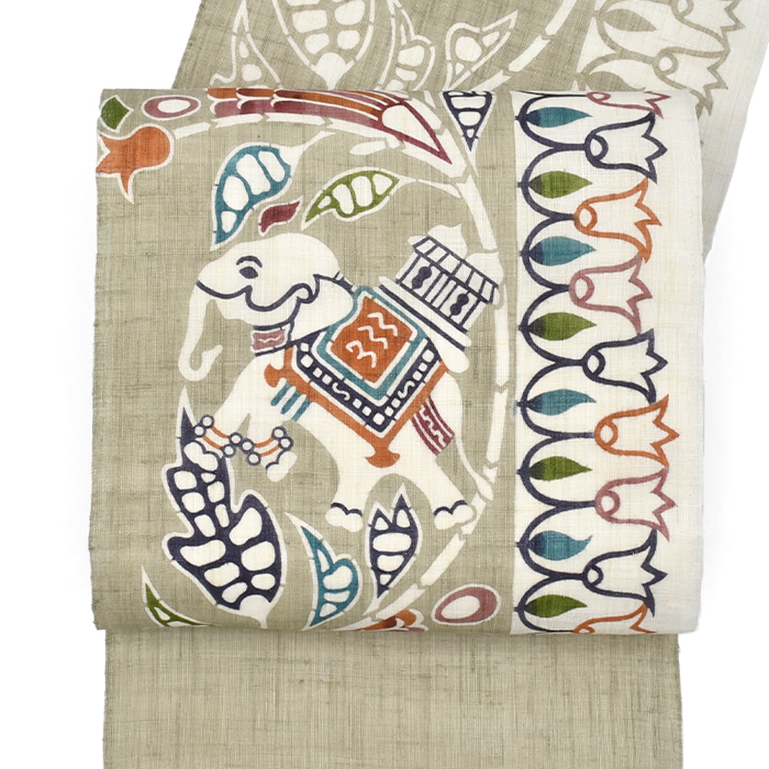 [名古屋帯]【ちょっと訳あり】(単衣/夏)本大麻 栗山吉三郎 謹製 和染め紅型 象更紗 九寸帯 麻 日本製(商品番号:22000)