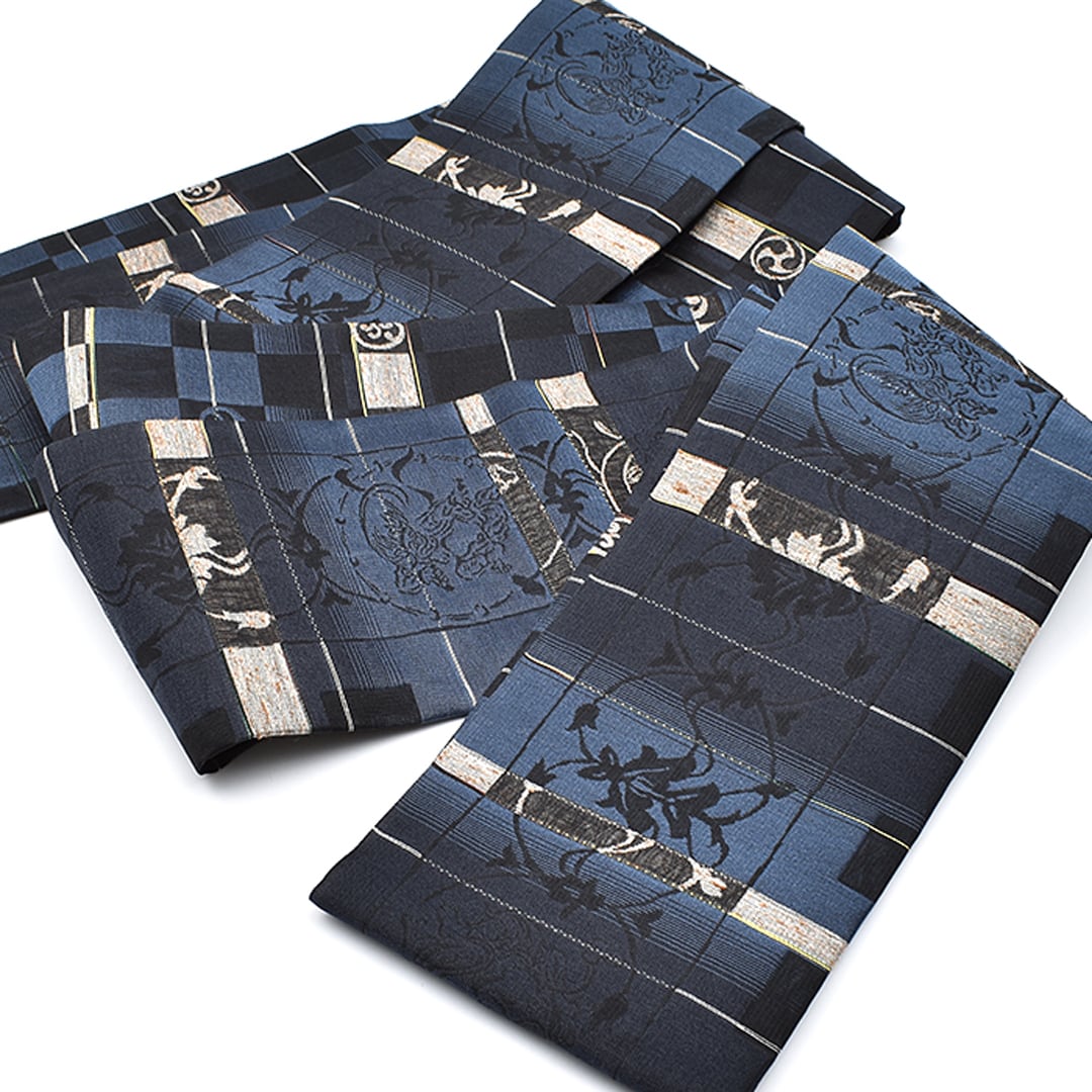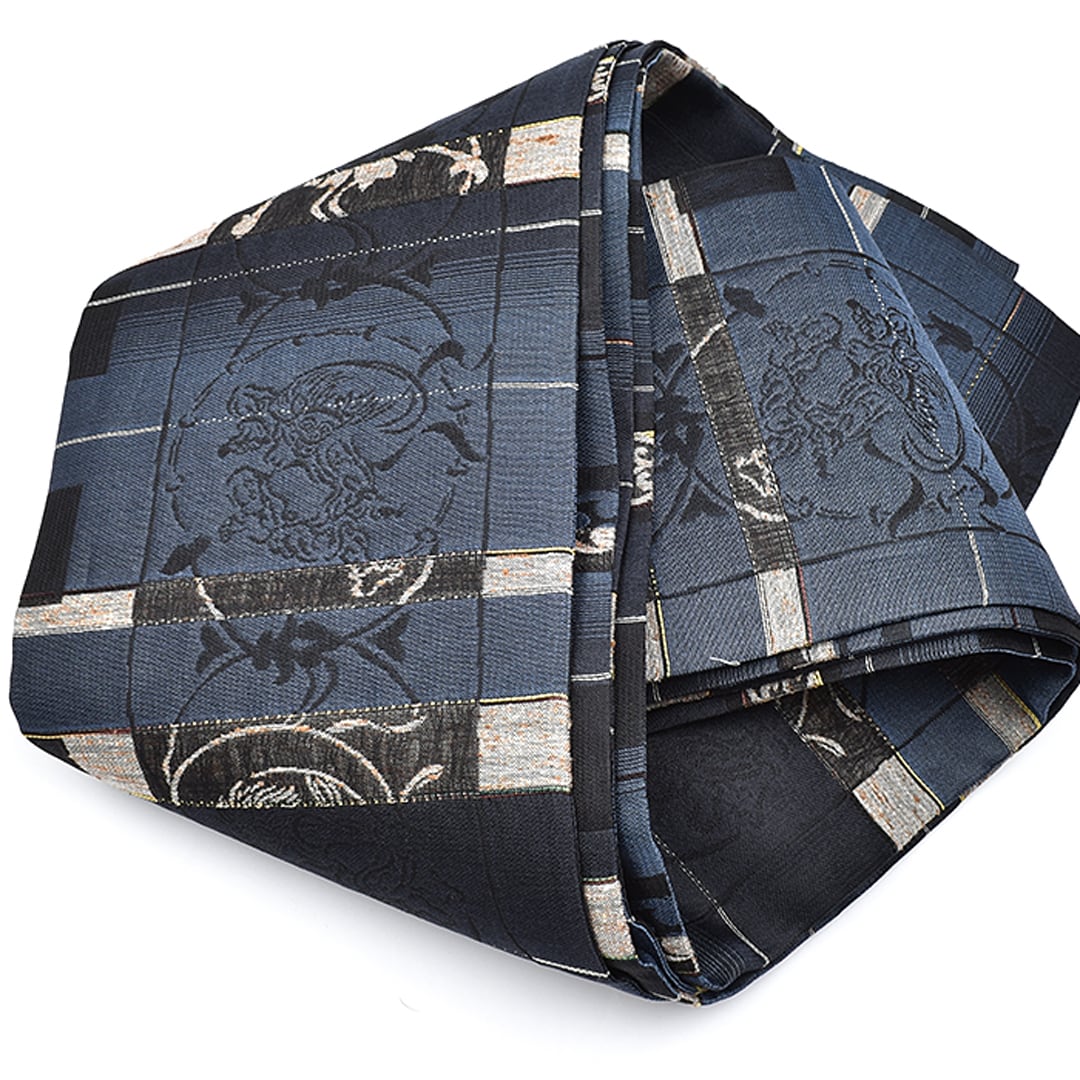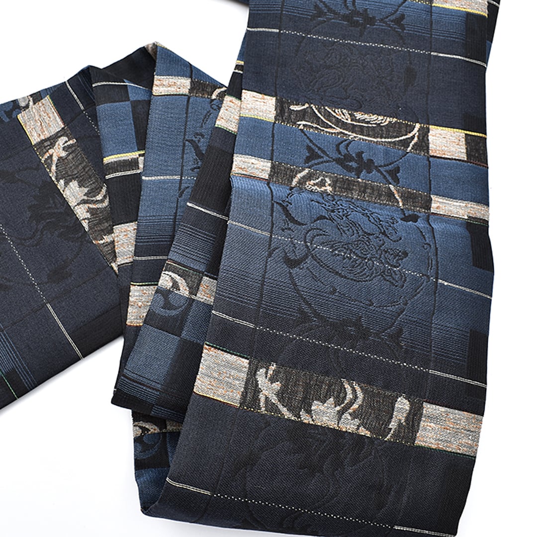 [半幅帯]【長尺/広幅】(お仕立て上がり)西陣織機屋 謹製 風神雷神/格子文様 ぜんまい糸入 両面柄 正絹 日本製(商品番号:22137)