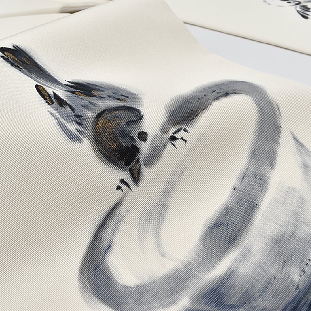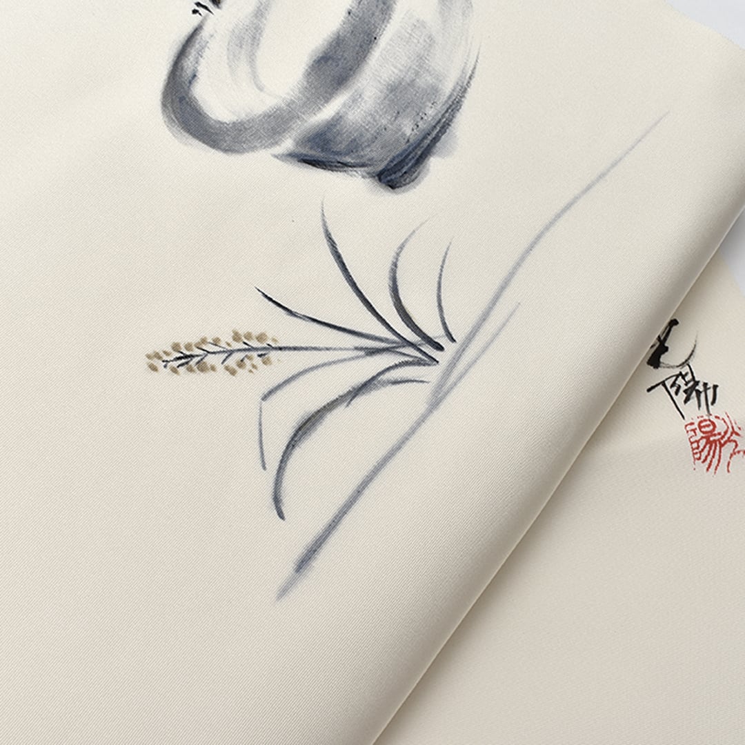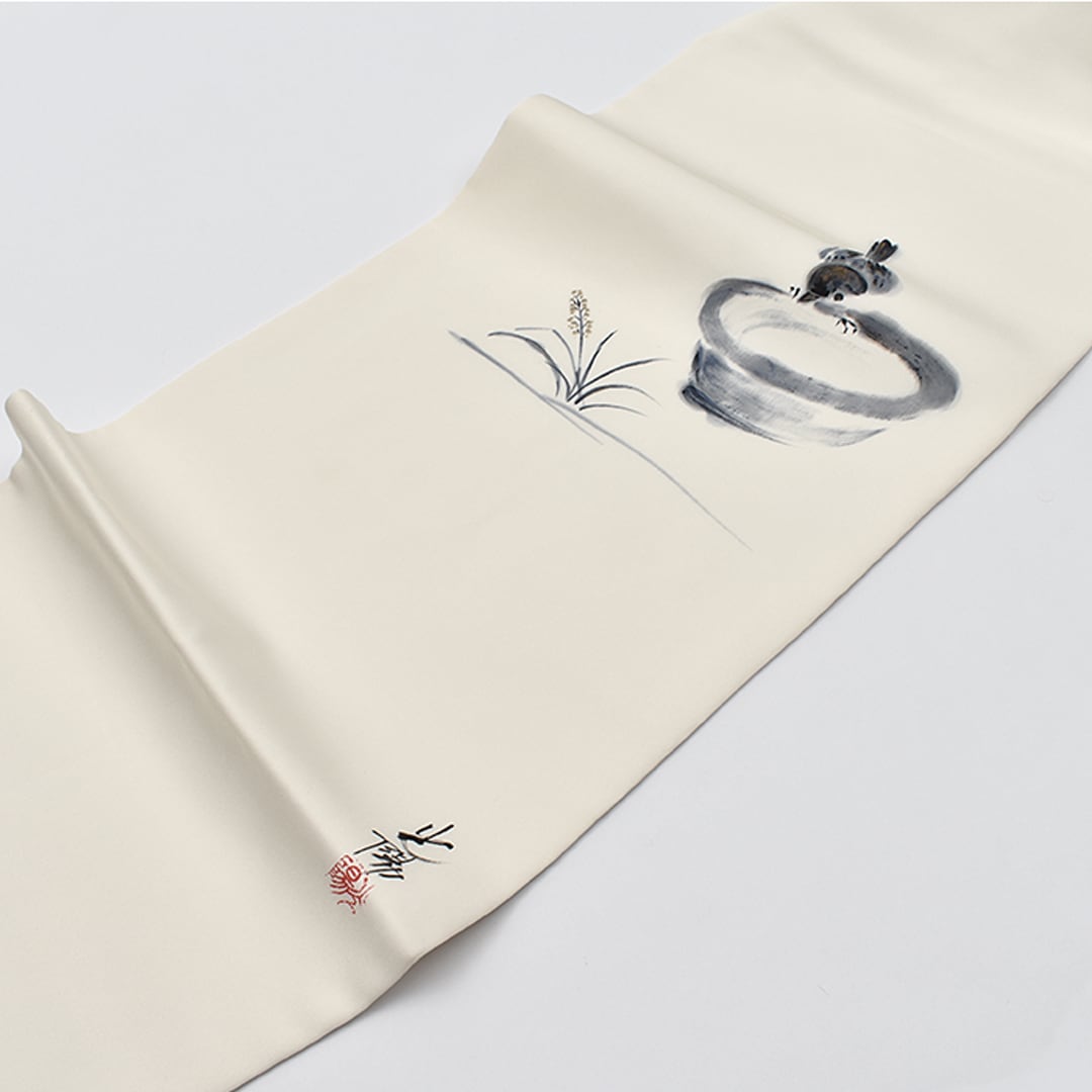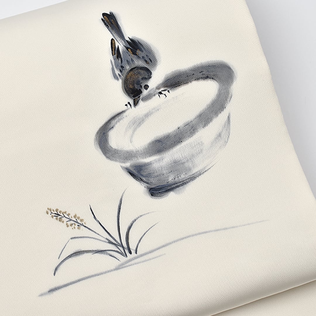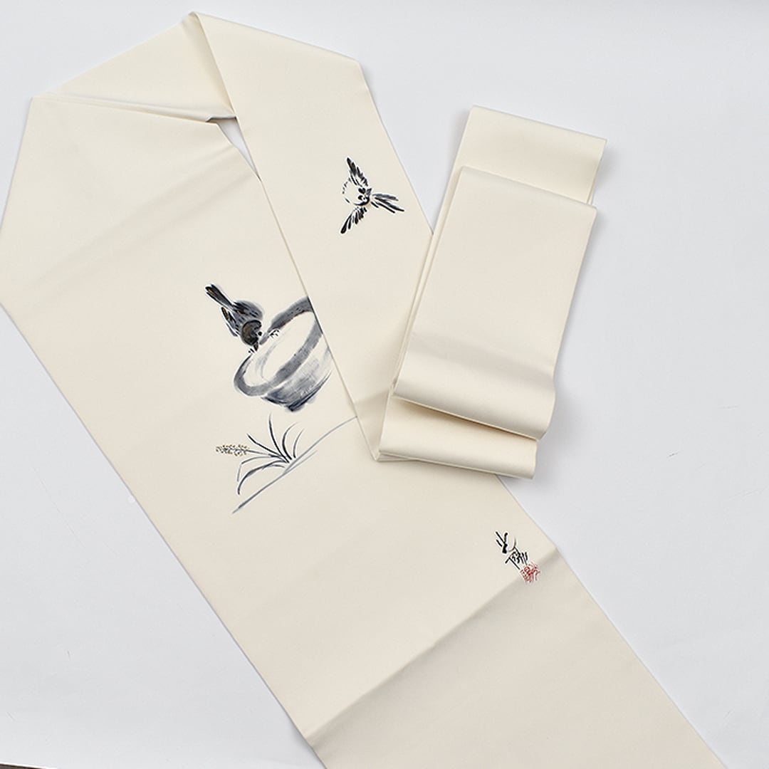 [名古屋帯]【中古帯】(お仕立て上がり)塩瀬帯 墨書き 雀 九寸帯 正絹 日本製(商品番号:22159)