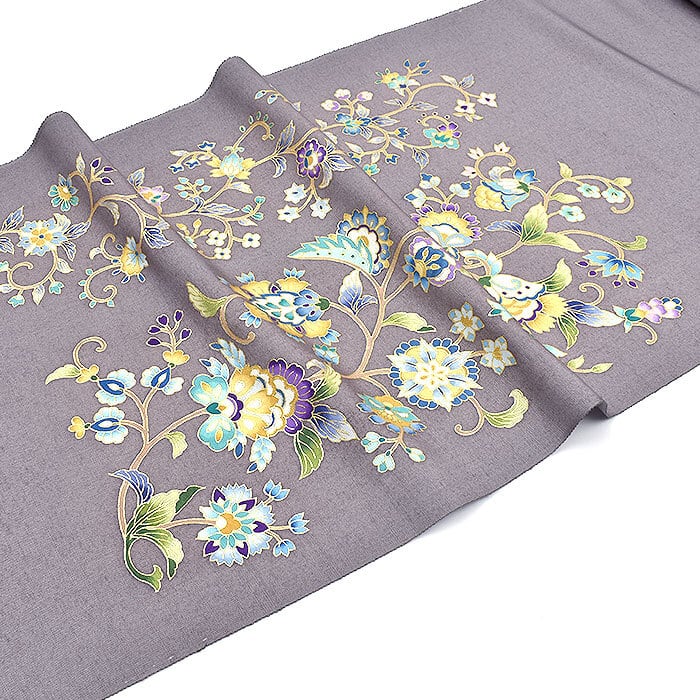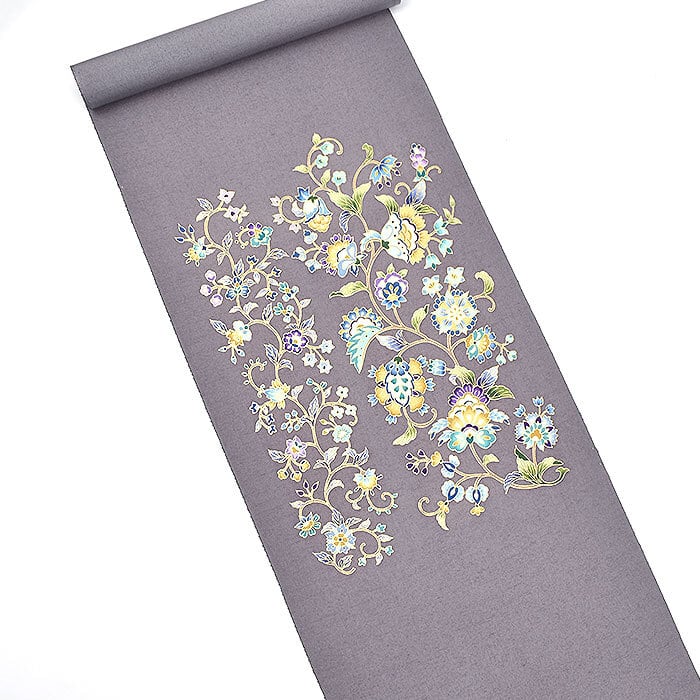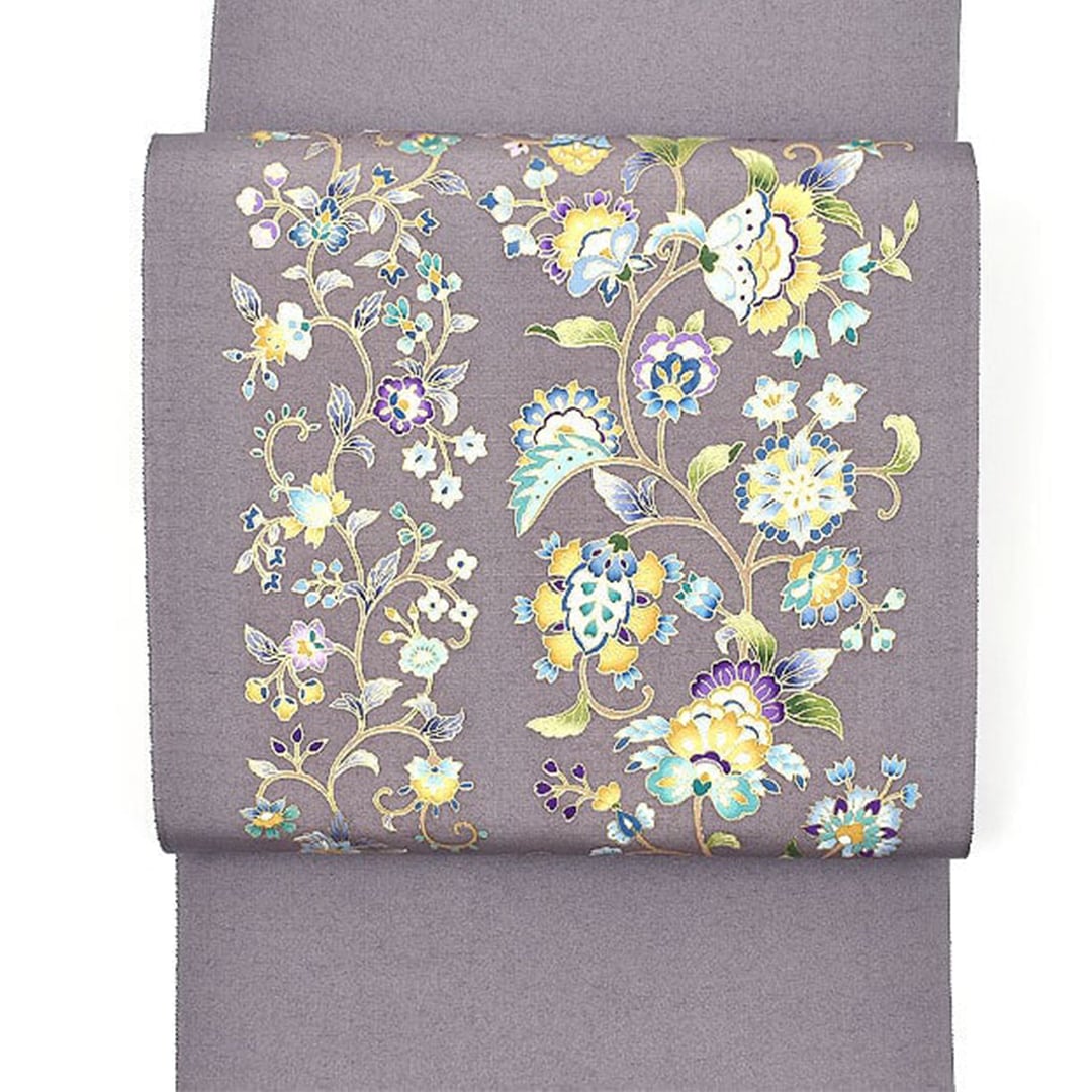 [名古屋帯]京の名門 岡重 謹製 岡重更紗 浜紬地 九寸帯 正絹 日本製(商品番号:22079)