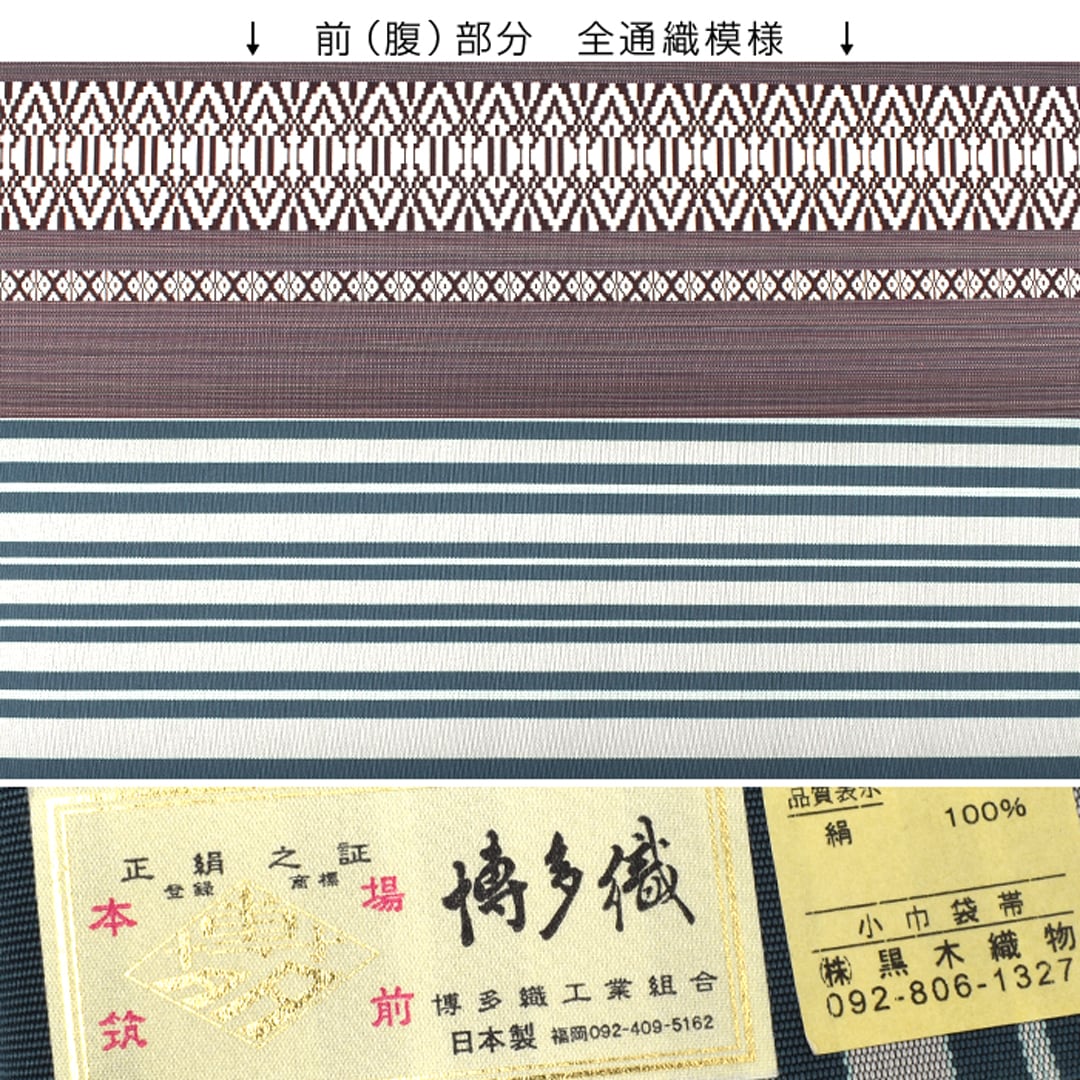 [半幅帯]博多織 名門 黒木織物 謹製 献上 両面柄 小袋 正絹 日本製(商品番号:22232)