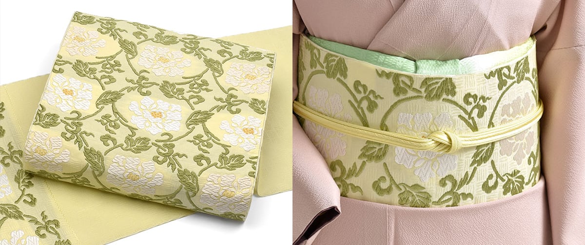 ※お電話でのご注文も大歓迎です! お気軽にお問い合わせくださいね ⇒ 0120-644-293(フリーダイヤル) ------------------------- 【商品について】 ・名古屋帯・お太鼓柄模様・素材:絹 ・サイズ:幅 約 31cm 長さ 約370cm 【合わせるお着物】付け下げ・無地・小紋・御召 【場面】 セミフォーマル~カジュアル 【季節】 春・秋・冬 【商品番号】 22119 さぁーー唐織のお話を 暑苦しく?しましょ~ 西陣織 唐織 名門 別注織 河合美術織物 名品牡丹唐花つなぎ文 九寸 名古屋帯 ご紹介! 帯地の黄色、絶妙な色トーンに 一目惚れして♪仕入れました! 春に抜群に合う♪色トーンでしょ~♪ 京都の西陣には 西陣織の高級帯だけを扱う問屋さんが 一軒あり、その問屋さんしか 卸さない帯がコチラのクラスの 河合美術織物さんの唐織 名古屋帯! なぜそこまで貴重かといいますと、 通常、唐織の帯の多くが袋帯なのですが こちらは名古屋帯であり 袋帯の機で、名古屋帯を織ることはできず わざわざこの唐織の帯だけの機を作り 織り上げた帯だからこそ 世の中に全く出回らない帯となり 手間暇がとてもかかる本唐織の帯は 織り上がる数量が極端に少なく 出来上がっても、関東のごく一部の 高級呉服店にしか並ばない、、 一目見た時から惚れ込み♪ 河合美術織物さんに仕入れられるよう お願いしていたのですが、 「この帯はちょっと卸先が決まっていて ダメなのよね~・・・」 と、断られ続けていたのですが お願いし、お願い続け 根負けして頂け、、 1年越しにやっと!仕入れてこられた これぞ!本物の唐織! 名古屋帯であっても、袋帯の格を持つ帯! 袋帯で西陣一の唐織を織り上げる事で有名な 〇木さんの唐織が、そのまま名古屋帯に なったかのような質の高さ! おびや店長鈴木が保証させて頂きます! 〇木さんの唐織に 全然!負けてない! そして、一つ注目して頂きたいのが 垂下の柄であり! 締めるた時に垂下にも柄が見えることで 帯全体の華やかさが増しますので コチラの帯に関しては 垂下柄ありが大正解♪ 帯地のお話・・・ 唐織は太い糸を使用しますので 帯地は薄い生地でないと 太い糸を正常に織る事ができず、、 その為、本物の唐織の帯地には 生糸(きいと)を使用するのですが 生糸とは蚕の繭から最初の方にでる 極細い糸で、全体の約10%しか採取できず 精錬される前の糸のまま使用され 糸自体は細いのですが とても丈夫で、唐織の帯地として 最適なのです! ちなみに、、本当に質の良い 唐織の帯かどうか?は 帯地を触り、薄く少しザラついた質感であれば 生糸の帯地であり、本物の唐織の 可能性が高いです! ただ、、高級な呉服屋さんで 「あら、帯地はしっかりと生糸の帯地ね!」 とか言った瞬間! うわー!かなりのお着物通の人! と呉服屋さんに思われ 高い呉服を勧められるので要注意!! ですが、この帯を締めらると、、 帯が勝手に語りだし・・ お着物通に見られますよー♪ 西陣織 唐織の名古屋帯としては おびや史上最高級!と宣言させて頂きます!